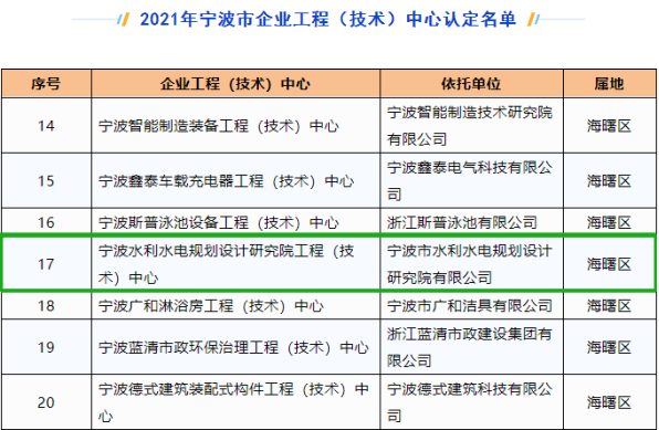 發(fā)布日期:2022.09.15 近日,寧波市發(fā)展和改革委員會、寧波市經濟和信息化局、寧波市財政局、寧波市科學技術局聯合發(fā)文,公布2021年寧波市企業(yè)工程(技術)中心認定名單。我院為主體申報的“寧波水利水電... -