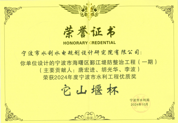 在工程項(xiàng)目方面,獲得2022年度全國優(yōu)秀工程咨詢成果獎、2024年度寧波市優(yōu)秀勘察設(shè)計(jì)獎、2024年浙江省勘察設(shè)計(jì)行業(yè)優(yōu)秀勘察設(shè)計(jì)”綜合類成果獎、寧波市優(yōu)秀水利工程設(shè)計(jì)二等獎、“浙江省文明標(biāo)化工地”稱號、“2024年度寧波軌道交通市域鐵路工程立功競賽先進(jìn)集體”等各類獎項(xiàng)十余項(xiàng)。