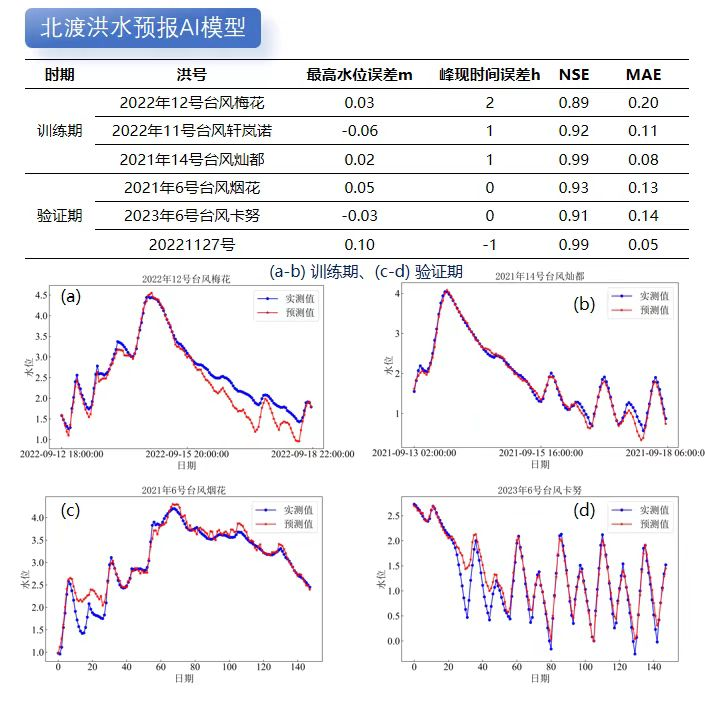 利用成熟水利專業(yè)模型模擬計算不同降雨潮位邊界條件下的洪水過程數(shù)據(jù),再基于DeepSeek對海量洪水模擬數(shù)據(jù)成果進(jìn)行模型訓(xùn)練和蒸餾。目前我院已對北渡、鎮(zhèn)海等重要流域控制站點(diǎn)進(jìn)行了AI洪水預(yù)報模型訓(xùn)練和精度驗(yàn)證,結(jié)果表明AI洪水預(yù)報的準(zhǔn)確性不輸傳統(tǒng)水利專業(yè)模型。