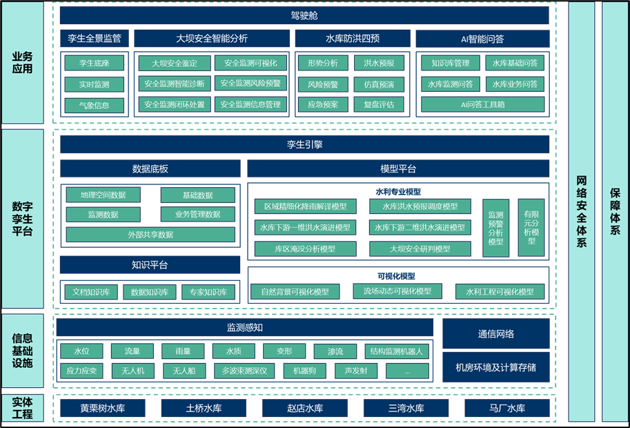 《方案》以黃栗樹等五座水庫為核心對象,進(jìn)行了前瞻性的信息化總體設(shè)計。旨在通過引入先進(jìn)信息技術(shù),構(gòu)建覆蓋水庫運(yùn)行管理全生命周期的智能化體系。該體系以實現(xiàn)對水雨情、工情、供用水、水質(zhì)及安全狀況等關(guān)鍵要素的精準(zhǔn)感知、動態(tài)監(jiān)測、智能分析與高效決策為核心目標(biāo),全面提升水庫在科學(xué)調(diào)度、風(fēng)險防控、管理效能與服務(wù)保障方面的綜合能力。主要建設(shè)內(nèi)容涵蓋智慧業(yè)務(wù)應(yīng)用、數(shù)字孿生平臺、信息基礎(chǔ)設(shè)施及網(wǎng)絡(luò)安全體系,共同構(gòu)成層次清晰、協(xié)同聯(lián)動、安全可靠的現(xiàn)代化水利信息化總體框架,為區(qū)域水安全與可持續(xù)發(fā)展奠定堅實的數(shù)字基石。