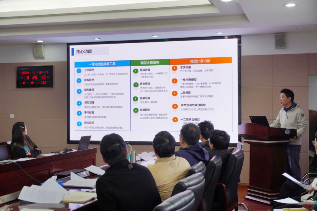 隨后,平臺(tái)研發(fā)團(tuán)隊(duì)代表陳龍贊對(duì)“澤圖水文水動(dòng)力一體化模型平臺(tái)”進(jìn)行詳細(xì)介紹,并進(jìn)行現(xiàn)場(chǎng)實(shí)操演示。該平臺(tái)是一套我院自主研發(fā)的以組件化建模、并行化求解、在線化計(jì)算、一體化耦合、國(guó)產(chǎn)化支持為核心的水文水動(dòng)力模型平臺(tái),能夠滿足包括產(chǎn)匯流計(jì)算、水庫調(diào)度、一維河網(wǎng)、二維淹沒、水文水動(dòng)力耦合、一二維水動(dòng)力耦合在內(nèi)的多種模擬需求,適用于獨(dú)立部署、嵌入第三方項(xiàng)目等多種應(yīng)用場(chǎng)景?;诮9ぞ摺⒛P头?wù)、計(jì)算核心三分離的設(shè)計(jì)架構(gòu),平臺(tái)具備分布式部署、集群化管理、多節(jié)點(diǎn)負(fù)載均衡的動(dòng)態(tài)能力,滿足靈活適用多種尺度的計(jì)算需要。